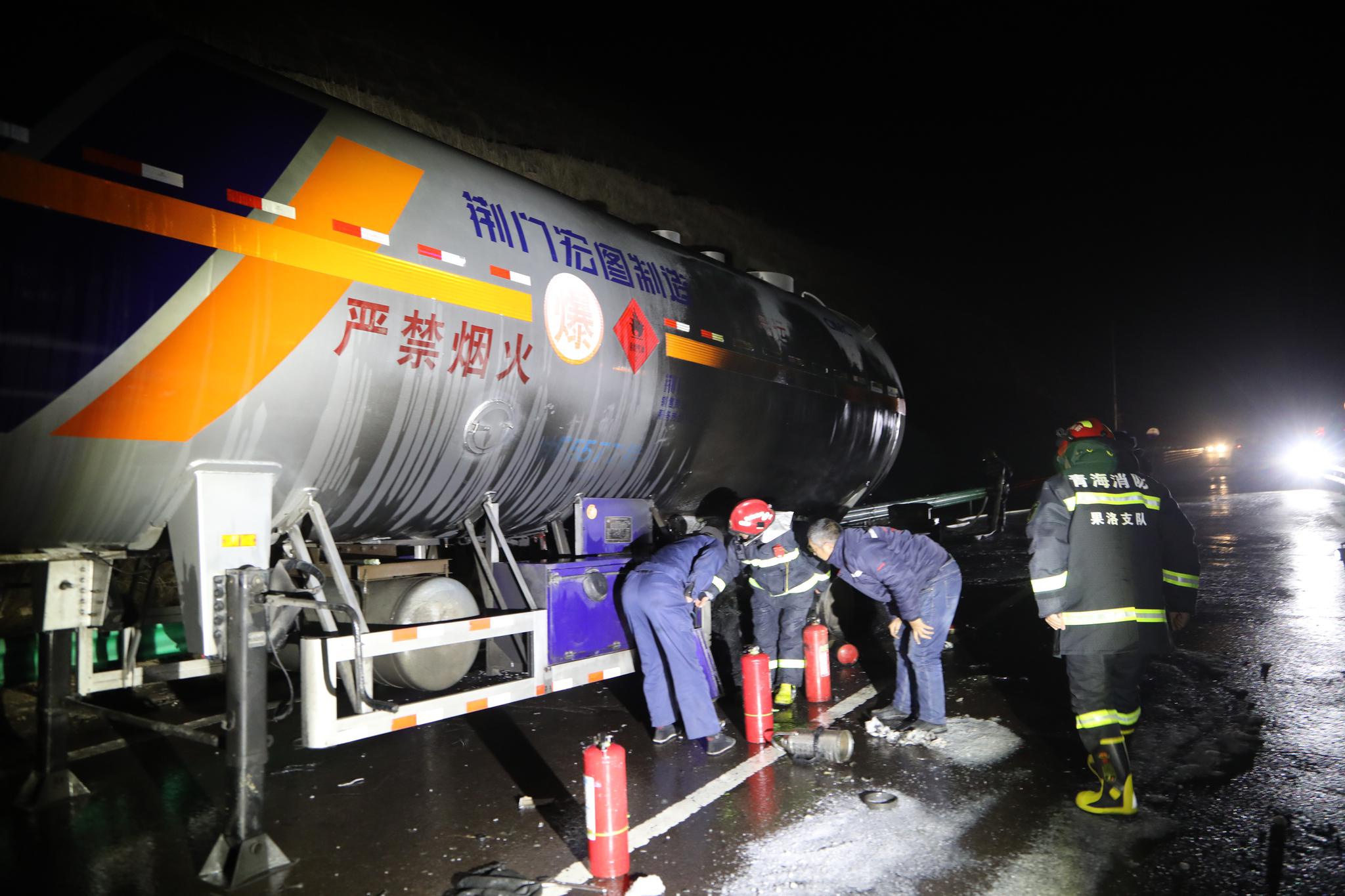 1月15日00时39分,青海德马高速日让沟特大桥(距果洛州玛沁县45公里)一辆载有23吨液化石油气的罐车起火,消防紧急救援。