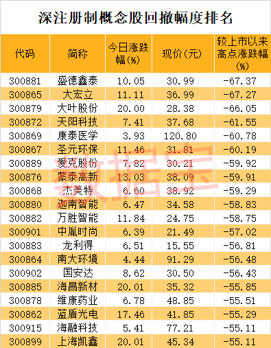 数据宝统计显示,以最新收盘价计算,与上市以来高点相比,有近八成的深注册制概念股跌幅超过30%。盛德鑫泰、大宏立、大叶股份、天阳科技、康泰医学、圣元环保等6股回撤幅度在60%以上。