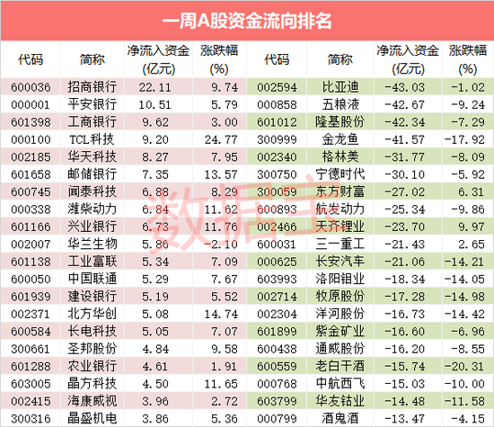 多只行业龙头股遭主力资金抛售,包括比亚迪、五粮液、隆基股份、金龙鱼、格林美等;比亚迪主力资金净流出额43亿元居首,该股本周小幅下跌1%。市值超万亿的白酒龙头五粮液主力资金净流出42.67亿元,本周累计下跌9.24%。五粮液发布的业绩数据显示,去年预计净利润为199亿元左右,同比增长14%左右。