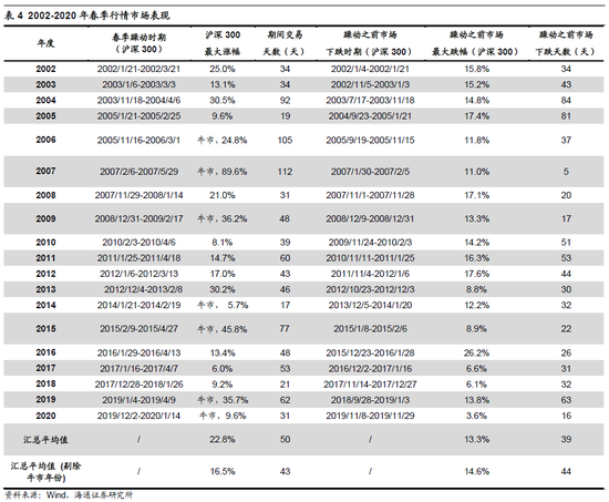 春季行情在路上。短期,我们认为春季行情或已正在路上。回顾2002年以来(沪深300历史数据始于2002年),春季行情启动时间差异大,启动有早有晚,最早在11月,最晚在2月初,平均持续时间近3个月,沪深300最大涨幅平均为23%。牛市中的春季行情涨幅更大,剔除牛市中春季行情(即剔除06、07、09、14、15、19、20年共7年数据),余下的11年春季行情持续时间最长92个交易日、最短仅19个交易日、平均为43天,期间沪深300涨幅最大30.2%、最小6.0%、平均16.5%;若只考虑06、07、09、14、15、19、20年这7年牛市中的春季行情,行情持续时间最长为112个交易日、最短为17个交易日、平均为65个交易日;期间沪深300涨幅最大89.6%、最小5.7%、平均35.3%,空间和时间明显较非牛市更大。这次春季行情属于启动较早,20年11月已经开始,沪深300已上涨两个多月,最大涨幅为20%。