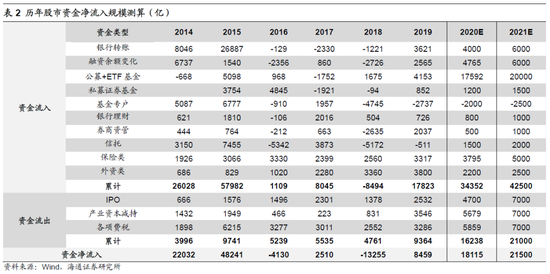 全年股市整体增量资金预计为2.1万亿元。在年度策略报告《“股”舞人心——2021年中国股市展望-20201127》中我们指出,根据我们的牛市三段论,2019年市场处在牛市孕育期,2020年处在牛市爆发期,2021年市场将进入牛市泡沫期。回顾历次牛市中三个阶段资金面的特征,我们得出的结论是,场外的增量资金在牛市孕育期尚在观望,在爆发期后期才开始入场,在泡沫期加速涌入。如12-15年牛市中,以创业板指来划分的牛市孕育期为12/12-13/04,以上证综指来划分的孕育期为13/06-14/03,爆发期为14/03-15/02,我们统计整个12/12-14/03期间的月均资金流入为500亿元,而14/03-15/02对应的月均资金流入为2200亿元,15/02-15/06期间月均值为1.6万亿。本轮牛市从2019年1月4日启动,从资金面的角度看,2019年全年资金净流入约8400亿元,月均700亿;2020年全年资金净流入1.8万亿,月均1500亿元,19、20年基本符合牛市孕育期和爆发期的资金入市特征。展望2021年,我们认为市场将进入泡沫期,场外资金有望加速入市,我们预计全年资金净流入约2.1万亿,详细测算见我们前期报告《增量资金望超两万亿——2021资金入市测算-20201204》。