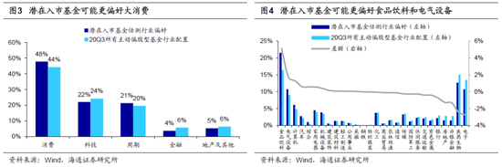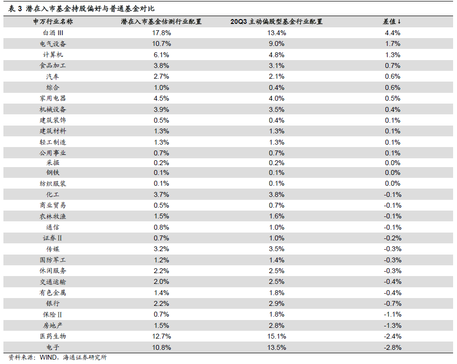 潜在入市基金相比其他基金更加偏好食品饮料、电气设备、计算机等行业。我们以20Q3全部主动偏股型基金的持股偏好为基准,分析潜在入市基金的持股偏好:从大类行业来看,潜在入市基金相对全市场的主动偏股型基金会更加偏好大消费类行业,潜在入市基金/全体主动偏股型基金在消费股的配置力度分别为48%/44%、科技股为22%/24%、周期股为21%/20%、大金融为4%/6%、其他为5%/6%;具体到申万一级行业,潜在入市资金可能较全市场的基金将明显超配食品饮料、电气设备和计算机,两者在食品饮料上的配置力度为22%/17%,电气设备上为11%/9%,计算机为6%/5%,潜在入市资金可能较全市场的基金将明显低配电子和医药,两者在电子上的配置力度为11%/14%,医药上为13%/15%,具体数据见表3。
