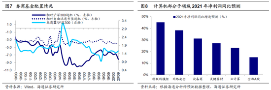 2021年行业配置的第二梯队是内需,回顾08年金融危机历史经验,货币宽松、四万亿等刺激政策推出后,高收入人群首先受益,08Q4-09Q2城镇居民人均可支配收入增速分别高于农村居民家庭人均现金收入增速的6.0%/1.6%/1.9%,这一阶段汽车、家电等耐用消费和高端白酒等可选消费行业需求旺盛,珠宝、化妆品、汽车等高端消费增速迅速上升;09Q3起随着基建、房地产投资落地和制造业、服务业用工需求扩张,农村居民收入增速逐渐超过城镇居民,粮油、食品、饮料等大众消费增速顺势崛起。2020年城镇居民收入受到疫情的影响较小,而农村居民特别是外出务工者收入受冲击较大,20Q3城镇居民人均可支配收入同比增5.4%,高于农村外出务工劳动力月均收入增速3.3%,因此2020年可选消费品中汽车和高端白酒表现亮眼。借鉴09-10年经验,预计乳制品、餐饮、超市等大众消费需求或将大增。根据海通分析师预测,2021年乳制品板块归母净利润同比增速预计为80%,餐饮预计为110%,超市预计为70%。
