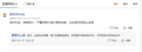 对于公司推出的定增预案,有投资者在股吧表达了悲观的看法,认为此举“稀释股价”、“损害长期投资者”。除此之外,持类似悲观看法的散户不在少数。