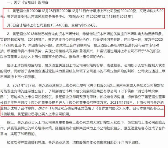 内容显示,景芝酒业自2020年12月28日至2020年12月31日合计增持上市公司股份209400股,交易均价为5.02元;景芝酒业委托北京御风堂商务服务中心(有限合伙)自2020年12月18日至2021年1月5日合计增持上市公司股份1554400股,交易均价5.24元。