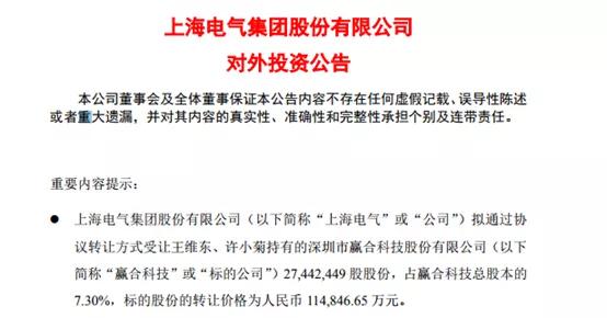 2020年2月17日,上海电气(601727)发布对外投资公告,拟通过协议转让方式,受让王维东、许小菊持有的深圳市赢合科技7.30%股份,转让价格为11.49亿元。