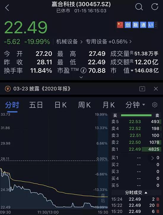 1月15日,股价已连续两日下跌的赢合科技股价再遭重创,截至收盘,公司股价已跌停,报22.49元/股,创下一年多以来新低,公司总市值也缩水至不足150亿元。而在1月12日当晚公司公布了2020年度业绩预告,13日收盘公司股价便跌近2%,14日收盘跌幅进一步扩大至7%以上。