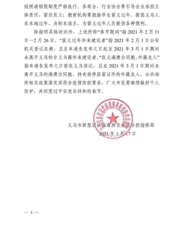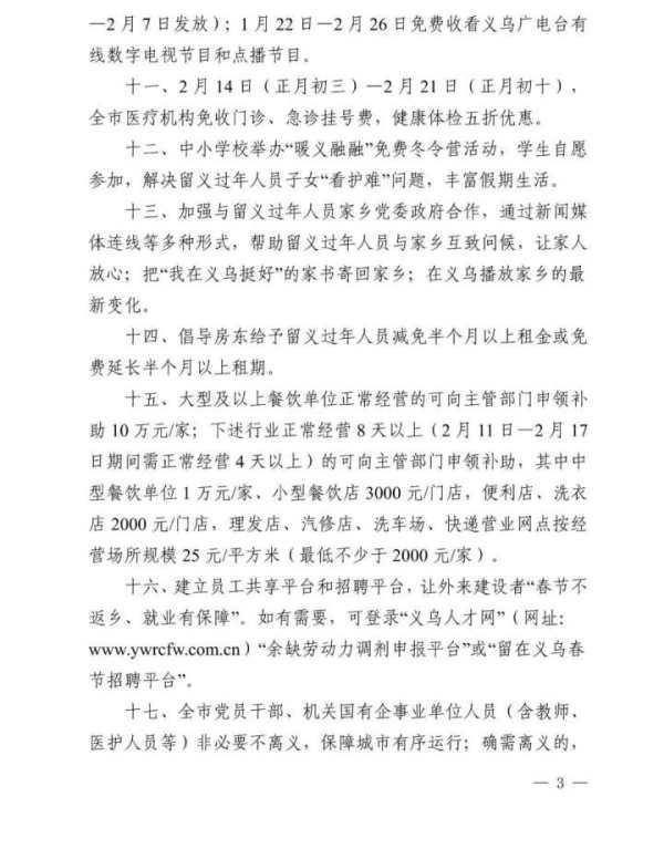 据“义乌发布”公众号18日消息,义乌新冠疫情防指通告2021年春节期间多项事项及面向留义人员福利措施,其中包括鼓励企业发放“留岗红包”“过年红包”,错峰放假调休,以岗留工、以薪留工;2月1日-26日,留义过年人员可通过支付宝申领“新年红包”电子消费券500元/人;留义过年人员可免费获得20G/人流量包;1月22-2月26日期间可免费收看义乌广电台有线数字节目和点播节目;全市医疗机构免收门诊、急诊挂号费,健康体检五折优惠;倡导房东给予留义过年人员减免半个月以上租金或免费延长半个月以上租期等。