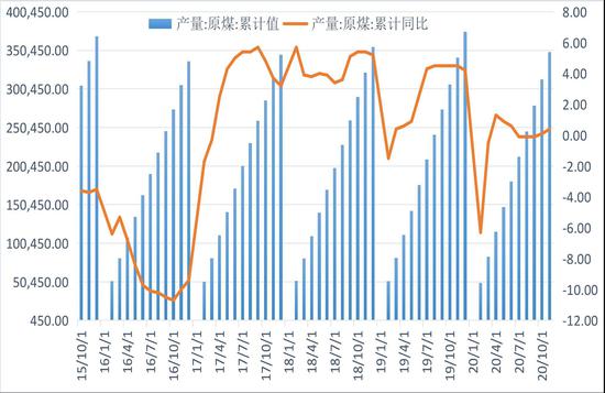2020年最新数据显示,11月份全国原煤产量34727.3万吨,同比增长1.5%,增速明显放缓,尽管目前保供任务已经下达,但预计部分矿上以完成年内任务为主,增产动力明显不足,12月增速或小幅回落。1-11月全国原煤产量348173万吨,同比仅增长0.4%,增速同比回落4.1个百分点,同比增量仅7452万吨,这一数据势必难以与高速恢复的需求相平衡。而增量有限的原因主要在于两点:一是因为年初疫情造成煤企工人返工困难,影响初期开工,尤其是二月年后疫情期间,生产一度处于停滞的状态,这也导致第一季度原煤产量呈现负增长的态势。随着工人返工,开工回暖,原煤生产一度大幅走强,但随后内蒙等地反腐行动的开展,则成为增量受限的第二个原因。从二季度开始,内蒙地区的生产始终受到影响较大,煤管票管控严格,开工率大幅下降,同时反腐工作的开展势必对表外产量造成打压,客观上来看,也使得实际供应情况更显紧张。