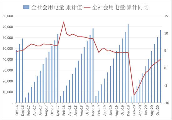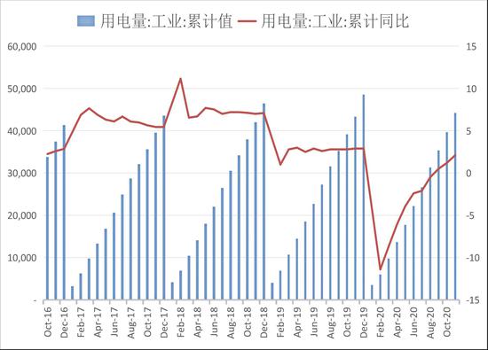 工业用电方面,1-11月份,全国工业用电量达到44215亿千瓦时,累计同比恢复至2.1%,增速相比年初,恢复明显,占全社会用电量比重达66.22%,占比降0.28%,近年处于连续下降的阶段;对全社会用电量增长的贡献率则继续下降。