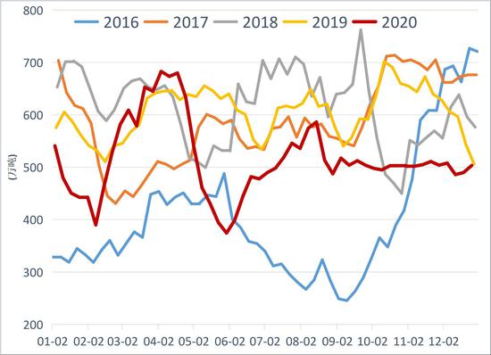 截至12月22日,秦皇岛港口煤炭库存为506万吨,同比减少了24.5万吨,近四年来呈现逐年递减的状态。年初经历过大幅波动之后,库存逐渐走平,尤其是8月以后,库存持续处于500万吨附近,累库乏力。从最新的环渤海六港口数据来看,当期数据报1189.6万吨,为2月疫情以来的新低,同比则是减少了约310万吨,过年前后保供形势较为严峻,这也是年末煤价放量冲高的主要原因。2020年北港库存迟迟未能累库,一方面还是受到整个供需情况的影响,上游受安检及反腐影响,产量紧缩,而下游工业生产自疫情以来恢复良好,需求火爆;另外一方面,处于冷冬预期,前期东北地区煤炭冬储开展的较早,分流了部分发往北港的资源,也使得港口在较为关键的入冬前期,并未积累足够的库存;同时,2020年下半年如大秦线的检修以及多次的事故也对北港的调入量造成一定影响。