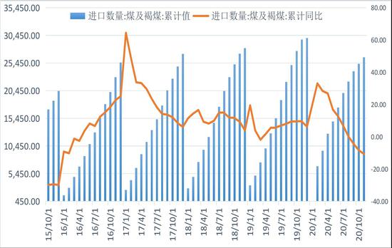 进口方面,19年自10月底额度用满之后,就处于停滞之中。故2020年一月进口煤市场重新开放,进口煤大量涌入国内市场,一定程度上使得动力煤市场供应充足,而随着疫情爆发后,国内煤矿延迟开工,对于煤炭供应压力的隐忧,使得进口煤市场一直处于无序开放的状态,进口累计同比增幅一度高达33.1%,导致进口额度在进入三季度后就几近用满,自8月起,各海关进口通关再度收紧,尤其是澳煤部分至今仍未能通关,进口前期完全开放和后期一刀切的举措,一定程度上促使动力煤上下半年呈现出截然不同的表现。从煤炭进口的统计来看,2020年1-11月累计进口煤炭已达2.65亿吨,进口累计同比降幅达10.8%,而进入12月以来,由于煤炭紧缺的现状严重,冬季保供的要求随即下达,故沿海进口煤市场近期新增了部分配额,但目前这部分配额属2020年新增,还是提前用了2021年的额度仍不明晰。同时,澳煤的通关受到中澳经贸摩擦的影响,目前仍未有放松迹象,考虑到澳煤种高卡煤资源较多,这也造成了市场上高卡煤紧缺的现象。下个月进口市场重新开放,届时仍将同去年一样,对南方电厂库存形成重要补充,缓解当前的压力。从政策角度来看,“十三五”以来的动力煤进口平控政策仍有望延续,同时,由于动力煤市场紧平衡局面加剧,也不排除后期,会阶段性地增加进口配额。