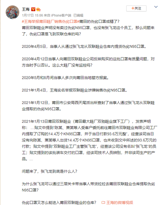2021年1月4日,王海实名举报双联鞋业涉嫌销售伪劣N95口罩。