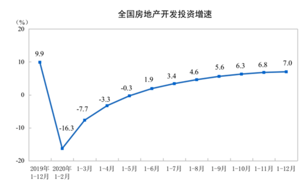 据国家统计局数据显示,2020年1-12月,全国房地产开发投资为141443亿元,比上年增长7.0%,增速比1-11月份提高0.2个百分点,比上年回落2.9个百分点。其中,住宅投资104446亿元,同比增长7.6%,增速比1-11月份提高0.2个百分点,比上年回落6.3个百分点。