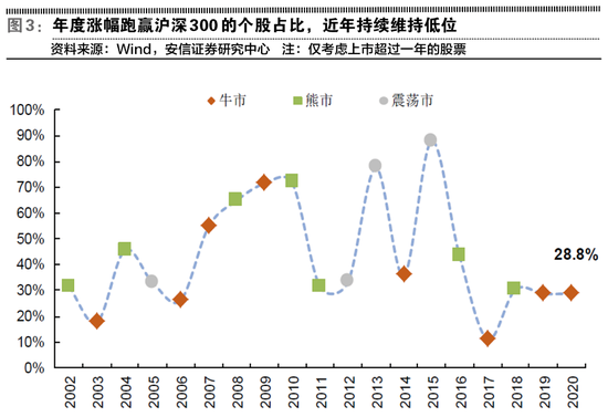 安信证券表示,在注册制和退市制度改革下,A股市场两极分化加速,投资趋势转向龙头,成交量逐渐向龙头集中,退市股大幅增加,同时机构投资者占比上升。A股近年来也确实呈现出跑赢指数的公司占比始终处于低位的情况,除了2017年仅11.1%的公司跑赢沪深300的极端情况,近3年这一比例也一直在30%及以下的水平。