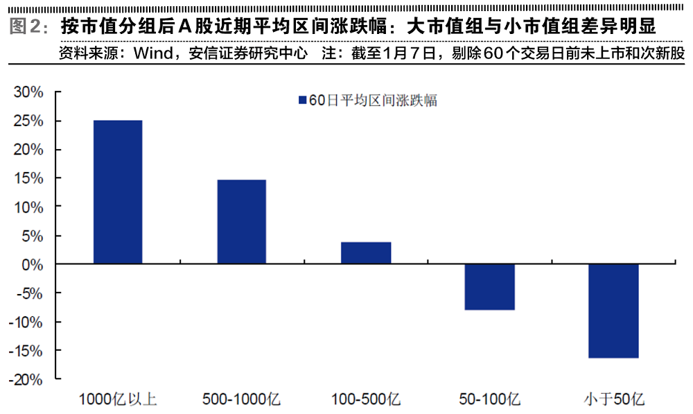 进入2021年,A股市场结构性分化愈演愈烈,指数与行业龙头不断上涨,而众多中小市值股票却无人问津且跌跌不休。据统计,按照市值区分,最近60个交易日以来,1000亿元以上市值对应的公司平均涨幅为22.6%,500亿-1000亿元的公司平均涨幅为18.7%,200亿-500亿元平均涨幅为12%,100亿-200亿元平均为3%,50亿-100亿元平均则为-2.7%,50亿元以下平均跌幅更是达到-9.4%。