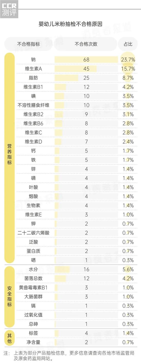 婴幼儿米粉抽检所涉及的项目主要是营养和安全指标,抽检结果发现,32个不合格指标共计出现287次,营养指标不合格有244次,占比达到85%。