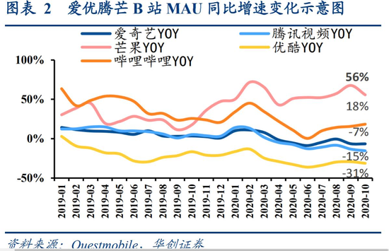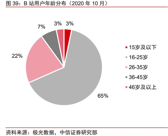 市场观点认为,B站用户活跃度的降低,可能和平台的破圈有关。目前平台的增长用户中,下沉市场用户和年长用户的比例正在增加,这或一定程度上稀释了活跃水平。根据极光大数据,2020年10月B站16-25/26-35岁用户的占比分别为65%/22%。