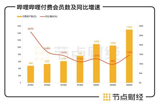 2020年三季度,B站平均每月付费用户达到1500万,同比增长146%。不过,这一水平和爱优腾相比还是相差甚远。