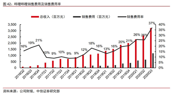 营销支出攀升下,2019Q1到2020Q3,B站的销售费用率从13%上升至37%。