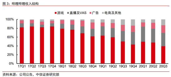 2020年Q3,B站游戏业务同比增长37%至12.75亿元,营收占比已降至39.53%。2019年同期该比例曾高达50%,2020年Q2为47.68%。