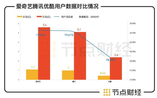 对比QuestMobile2020年7月的数据可以发现,B站的用户活跃度(DAU/MAU)可以说是吊打腾讯、优酷和爱奇艺(简称“优爱腾”)等几家竞品公司,后三家公司的用户活跃度分别为19.6%,18.2%和19.6%。