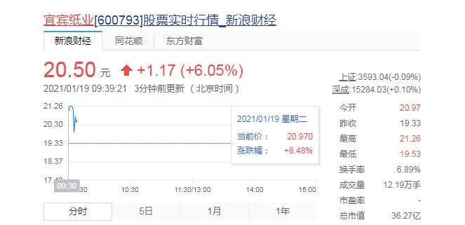 1月6日以来,宜宾纸业连续涨停,截至18日收盘,共收获9个涨停板,总市值从近16亿飙涨到34亿。20日截至发稿前,宜宾纸业报20.50元,市值36.27亿。