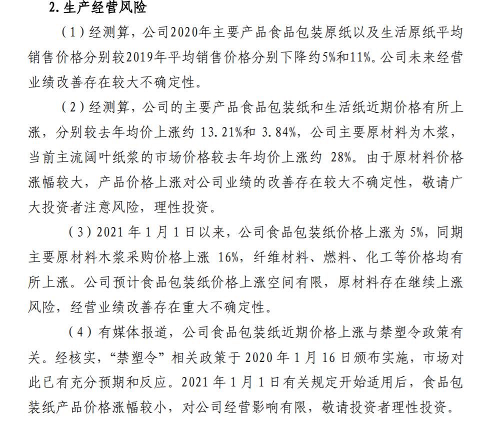 据统计,这已经是宜宾纸业本月第6次公告提示风险。在这份公告中,宜宾纸业强调,纸价上涨和禁塑令政策对公司经营影响有限,经营业绩改善存在重大不确定性。