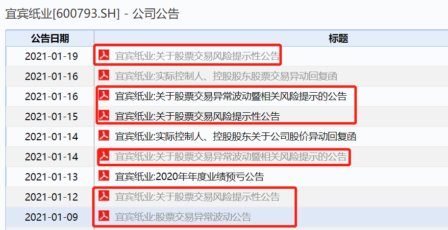 1月18日晚,宜宾纸业公告称,公司股票连续九个交易日涨停,累计涨幅已达134.59%,期间上市公司基本面未发生改变,公司股价存在炒作的风险,敬请投资者注意二级市场交易风险。