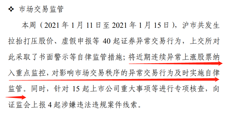 上周五,即1月15日,上交所例行发布沪市市场运行情况。上交所表示已将近期连续异常上涨股票纳入重点监控,对影响市场交易秩序的异常交易行为及时实施自律监管。