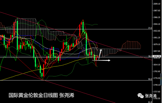 周线级别:金价本周已虽探底回升,再度站上自1451美元而起的支撑线上方,不过目前仍面临200日均线的初步压力,突破持稳则看好多头的继续反弹,如再度跌破支撑线则有下探1800美元乃至1765美元的空间。 上方关注1850及1857美元阻力,进一步关注1880美元,如不能稳健突破1890美元,仍然是高空为主,突破则看逢低跟进。