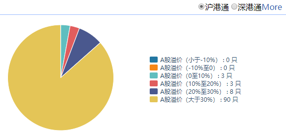 当前,AH溢价指数为136.0,较前一周有所下降,但仍处于近四年以来的高位水平。Wind统计显示,沪港通104只交易标的中,A股溢价大于30%的便有90只个股;深港通26只交易标的中,A股溢价大于30%的有17只个股。