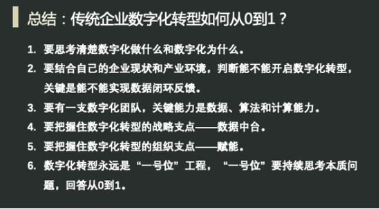 我觉得最核心的还是第六点,数字化转型永远是“1号位”工程。在我看来,传统企业的数字化转型就是一次创业。