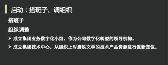 转型刚启动我们就做了一次组织调整——成立了集团业务数字化小组,这是我们数字化转型的领导机构。随后,我们还成立了集团技术中心,成立这个中心的目的是为了从组织上对磨铁文学的技术产品资源进行重新定位,把磨铁文学原来成建制的技术产品团队,调整到优先服务于数字化转型,同时兼顾磨铁文学的业务维护需求。