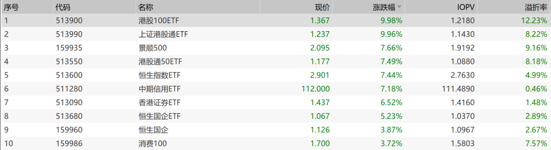 在此背景下,港股ETF也出现集体放量大涨,港股通50ETF、上证港股通ETF、香港证券ETF、港股100ETF、恒生指数ETF、恒生国企ETF等港股ETF一度涨停,场内ETF存在明显的高溢价交易,部分港股ETF溢价甚至超过了10%。截至收盘,上证港股通ETF、港股100ETF涨停,港股通50ETF、恒生指数ETF收盘上涨逾7%,香港证券ETF涨幅超6.5%,恒生国企ETF也上涨逾5%。