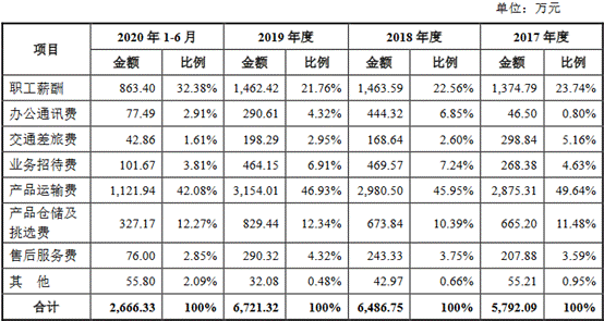 报告期内,明泰股份销售费用主要为职工薪酬、产品运输费及产品仓储及挑选费,报告期内上述三项费用占比分别为84.86%、78.90%、81.02%及86.73%。其中,职工薪酬分别为1374.79万元、1463.59万元、1462.42万元和863.40万元,占比分别为23.74%、22.56%、21.76%和32.28%;产品运输费分别为2875.31万元、2980.50万元、3154.01万元和1121.94万元,占比分别为49.64%、45.95%、46.93%和42.08%;产品仓储及挑选费分别为665.20万元、673.84万元、829.44万元和327.17万元,占比分别为11.48%、10.39%、12.34%和12.27%。