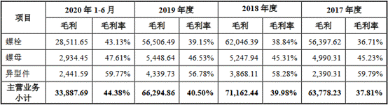 分产品来看,报告期内,明泰股份螺栓的毛利率分别为36.71%、38.84%、39.15%和43.13%;螺母毛利率分别为45.23%、45.31%、46.53%和47.61%;异型件毛利率分别为59.79%、58.28%、56.78%和59.77%。