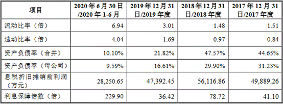 报告期内,明泰股份资产负债率(合并)分别为44.65%、47.57%、21.82%和10.10%,资产负债率(母公司)分别为31.23%、29.90%、16.61%和9.59%,流动比率分别为1.51、1.48、3.01和6.94,速动比率分别为0.84、0.97、1.69和4.04。