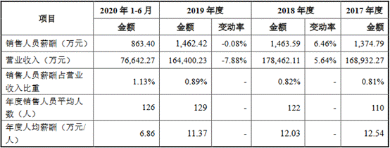 报告期内,明泰股份年度销售人员平均人数分别为110人、122人、129人和126人,年度人均薪酬分别为12.54万元/人、12.03万元/人、11.37万元/人和6.86万元/人。