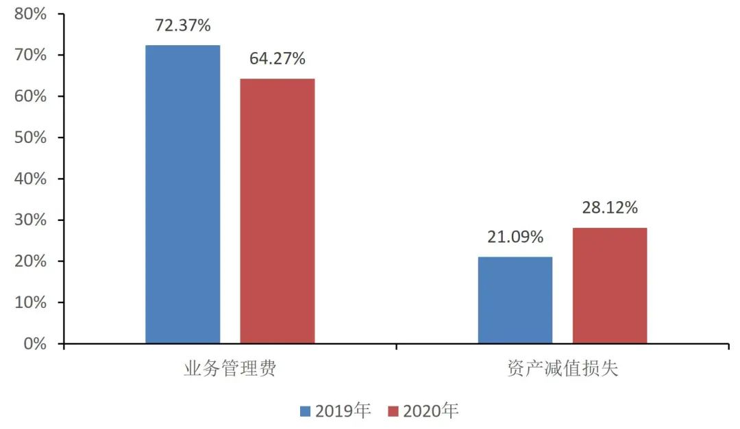 信托公司营业支出主要由业务管理费、资产减值损失2项构成,2项的合计占比超过90%。2020年,59家信托公司计提的资产减值损失较2019年整体增长了约65.43%,业务管理费的整体增幅约10.18%。因此,资产减值损失的大幅增长是信托公司2020年营业支出大幅增长的主要原因。2020年资产减值损失的大幅增长也导致其在营业支出中的占比提升至28.12%,较2019年提升了7.03个百分点。