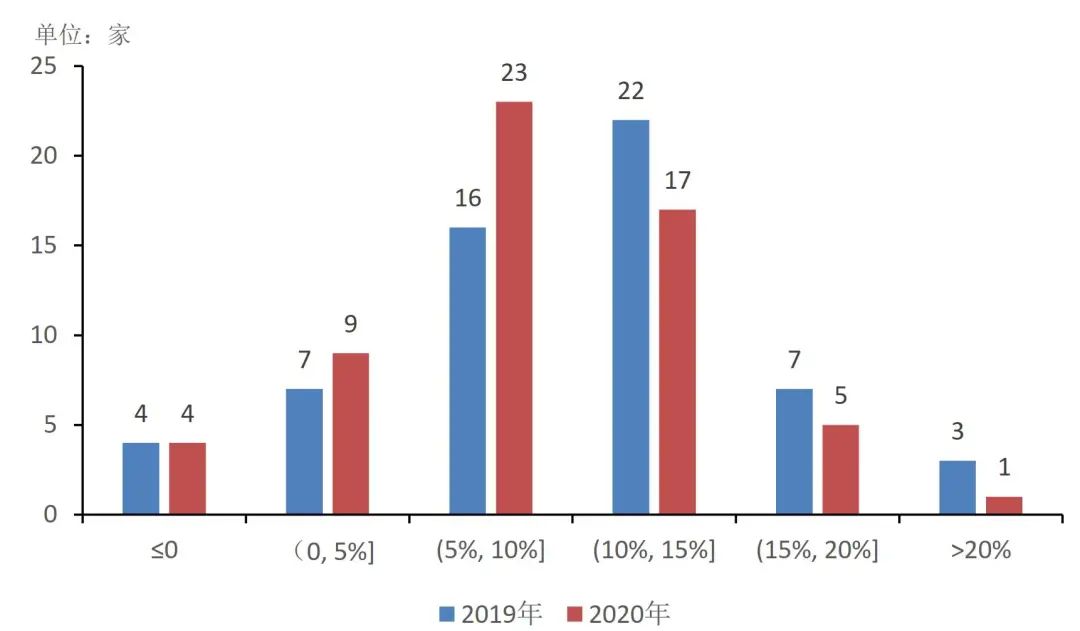 净资产收益率ROE可以用来衡量企业的盈利能力,反映资本投入产生收益的效率。信托公司2020年的ROE可通过净利润除以净资产计算获得,其中净资产采用2019-2020年的平均数。2020年,59家信托公司ROE的算术平均数为7.08%,加权平均数(以净资产为权数)为8.96%。加权平均ROE高于算术平均ROE,表明处于行业头部的信托公司对ROE的贡献更大,同样反映了行业分化的特征。从信托公司ROE的区间分布来看,2020年ROE处于10%以上的信托公司较2019年减少了9家。2020年,ROE区间为(5%,10%]的信托公司数量最多,为23家。而在2019年,信托公司数量最多ROE区间为(10%,15%],为22家。