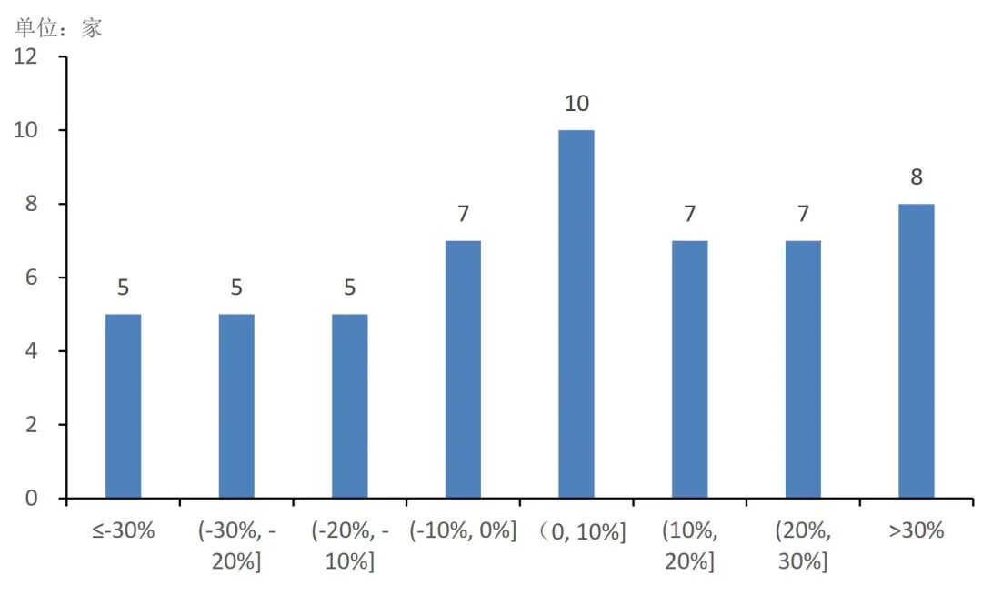 在59家信托公司中,排除2019-2020年净利润出现负数的信托公司,进一步考察信托公司的净利润增速情况。2020年,59家信托公司净利润的增速同样呈现分化局面。共有32家信托公司实现了净利润的正增长,占比约为54.37%。在净利润正增长的信托公司中,净利润增速处于20%-30%、30%以上2个较高区间的信托公司分别有7家、8家。与此同时,仍有22家信托公司2020年净利润为负增长。