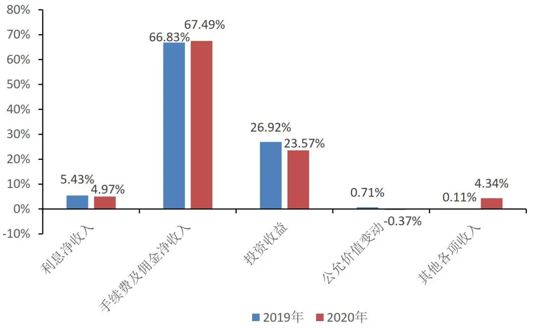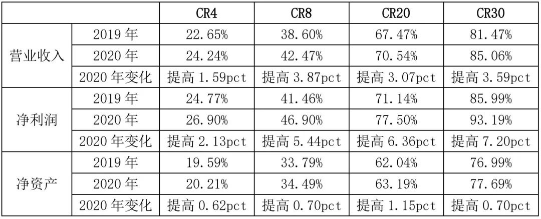 2020年,以营业收入、净利润、净资产计算的行业集中度均有不同程度的提高。其中,以净利润计算的市场集中度提高最为明显。2020年,以净利润计算的CR4指标较2019年提高2.13个百分点。而2020年以营业收入、净资产计算的CR4指标较2019年分别提高1.59个百分点、0.62个百分点。