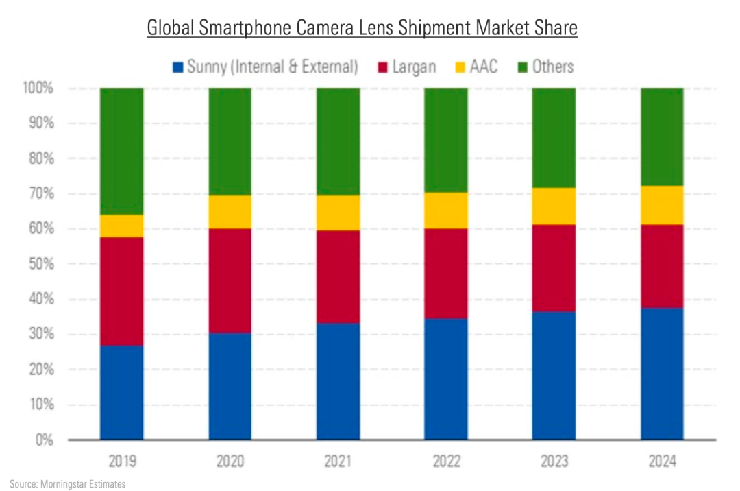 晨星的研究显示,贸易禁令的相关因素可能会对未来几年镜头行业的升级换代速度产生影响,一旦行业换代的步伐放缓,那么舜宇光学(Sunny)将成为最大的受益者。这将有利于其缩短与大立光电(Largan)的差距,预期舜宇光学的市场占有率将从2019年的27%增长到2024年38%左右,超过当前的行业第一名大立光电。(见图2)