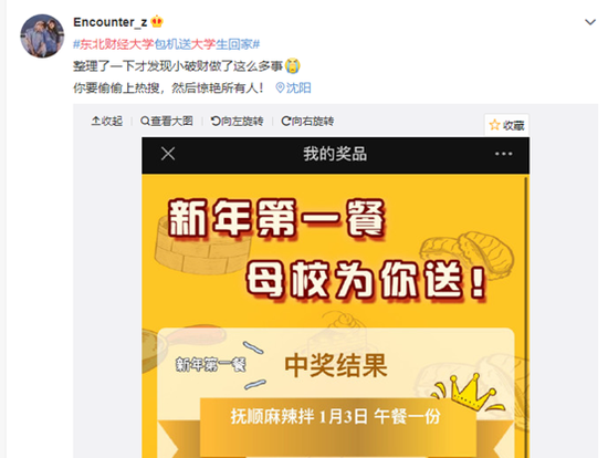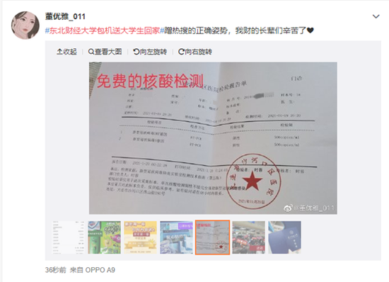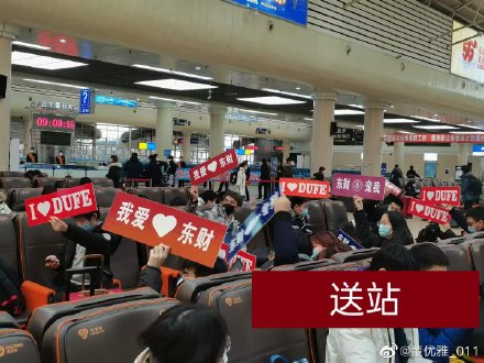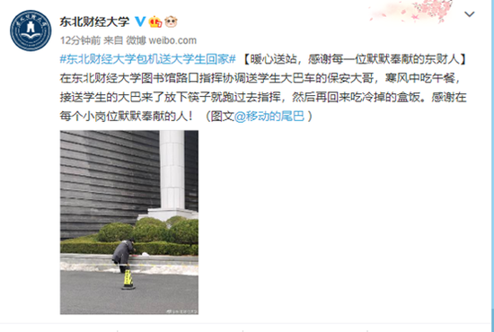 东北财经大学的官方微博里,除了更新包机送学生的实时动态,也对每位参与送站的工作人员表达了感谢。