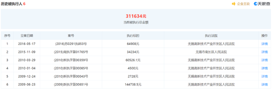 其中2015年,无锡市南长区人民法院还将其列为失信被执行人,俗称“老赖”。