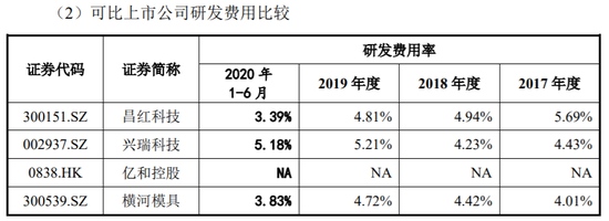开发创新产品和提高产品质量是市场竞争中非常重要的一步,然而,从研发投入情况看,思柏精密的研发投入力度一直处于同行可比公司中的垫底位置。2017年思柏精密的研发费用率还能勉强与横河模具和兴瑞科技持平,2018年和2019年就已经落后同行了,研发投入后劲不太足。