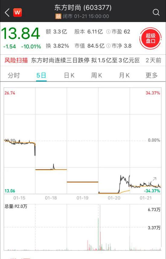 东方时尚通过回购入市“救场”改变了公司股价连续跌停的走势,但难以改变下跌趋势,1月21日公司股价再度大跌。