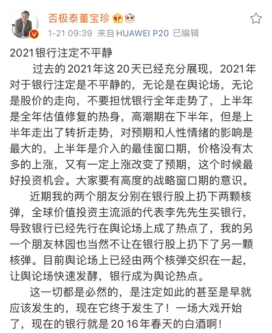 2021年1月21日,董宝珍又在微博中表示:2021上半年是银行股全年估值修复的热身,是介入的最佳窗口期,下半年将迎来高潮。