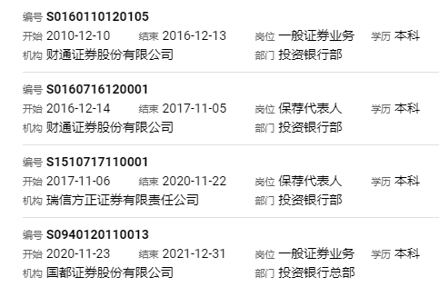 许翔飞则是财通证券“原生”的保代。学历为本科的他,自2010年12月起任职于财通证券投资银行部,历时六年,于2016年12月成为保代;2017年11月起任职于瑞信方正投资银行部,2020年11月继续“跳槽”至国都证券投资银行总部。